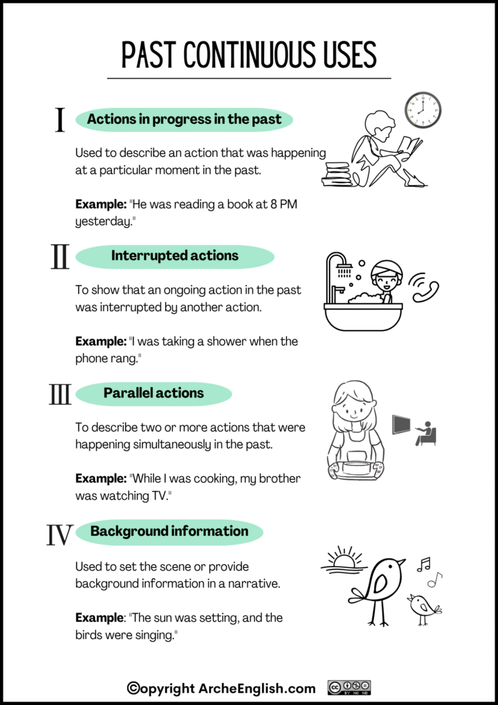 Pay attention to the past continuous structure — was/were + verb-ing.